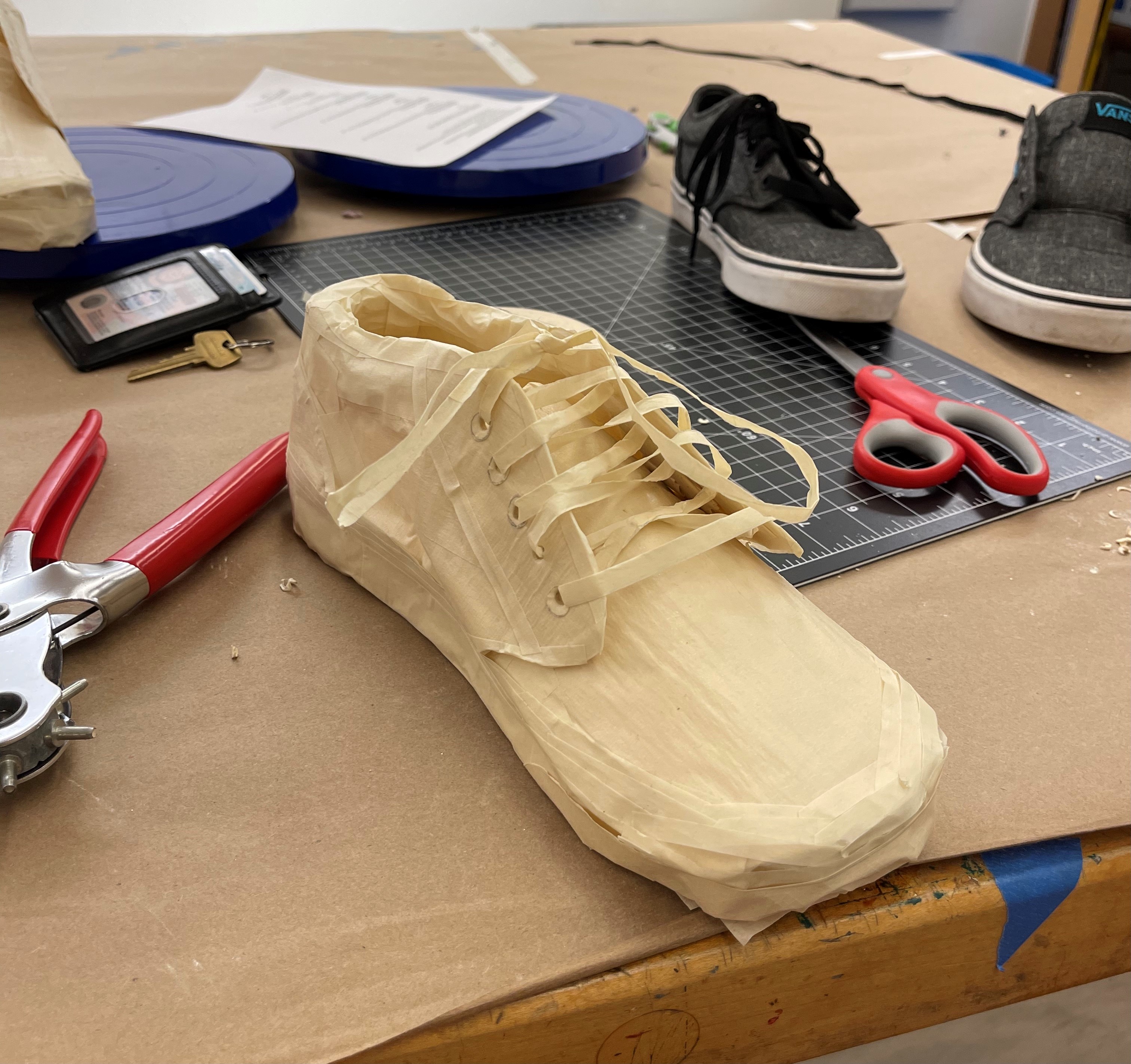 Modeled after the original pair of vans, the shoe is completely made of masking tape.